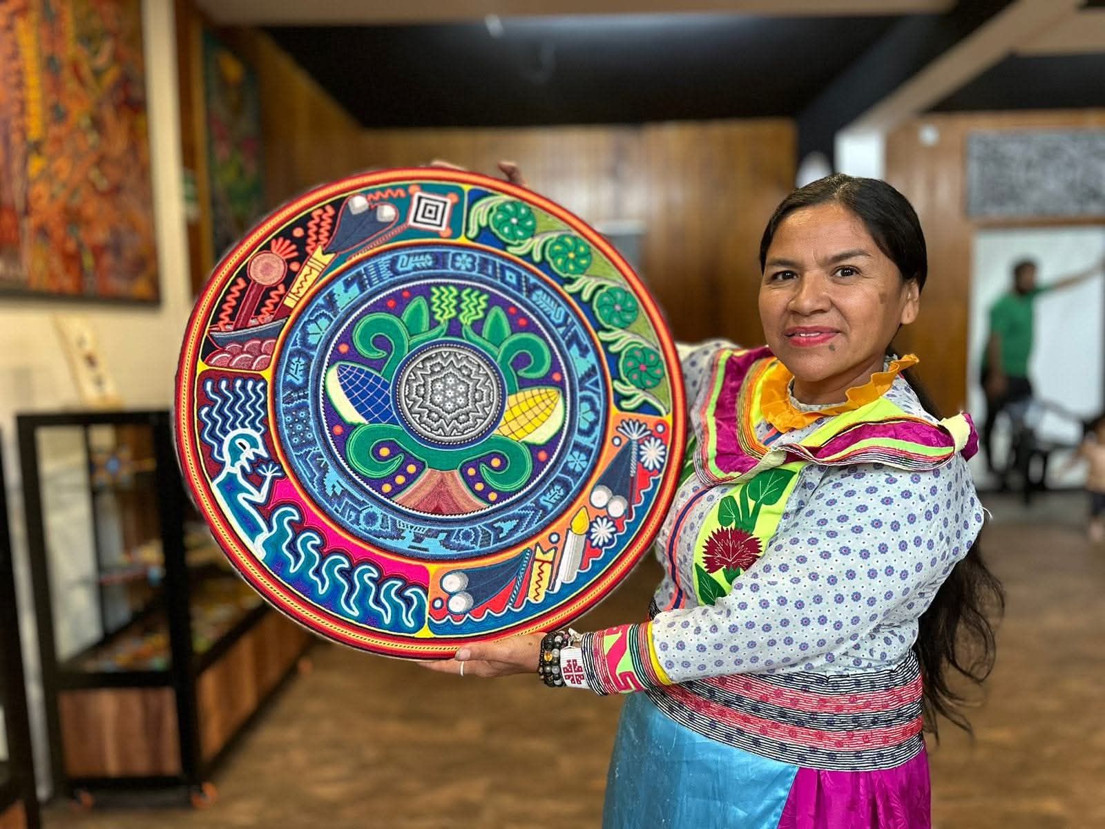 Técnica ceremonial para cuadros que narran nuestra cosmovisión. Los patrones tienen significados sagrados transmitidos por generaciones.